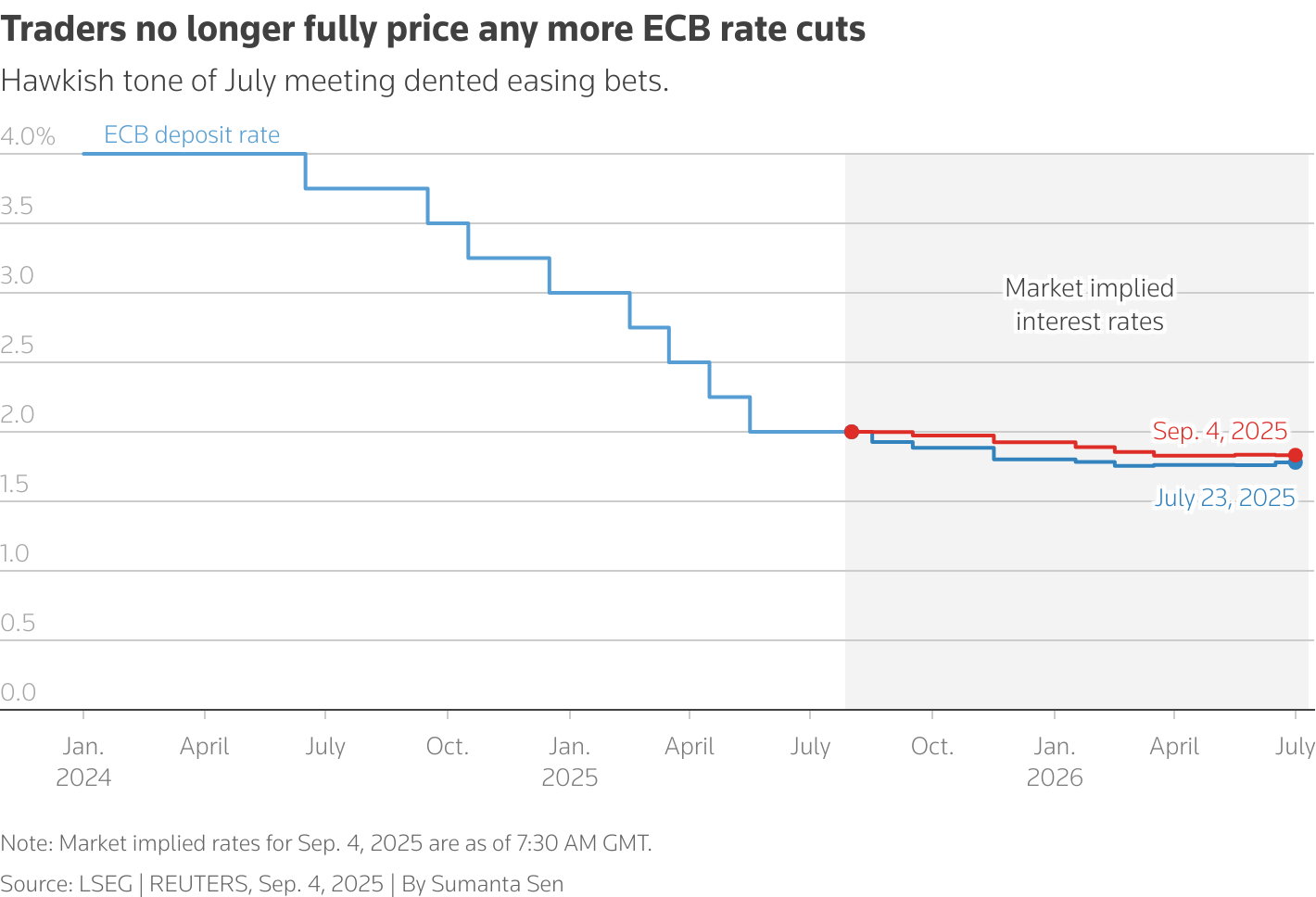 Οι αναλυτές που ερωτήθηκαν από το Reuters εκτιμούν ότι η ΕΚΤ έχει ολοκληρώσει τον τρέχοντα κύκλο χαλάρωσης. Οι επενδυτές βλέπουν περίπου 70% πιθανότητα για μια ακόμη μείωση, αλλά μόνο μέχρι το επόμενο καλοκαίρι.