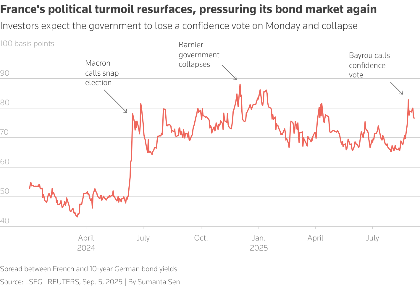 Οι αναλυτές εκτιμούν ότι οι πρόωρες εκλογές θα μπορούσαν να διευρύνουν το spread των αποδόσεων των 10ετών ομολόγων Γαλλίας-Γερμανίας από 76 μονάδες βάσης σήμερα σε περίπου 90 μονάδες βάσης.