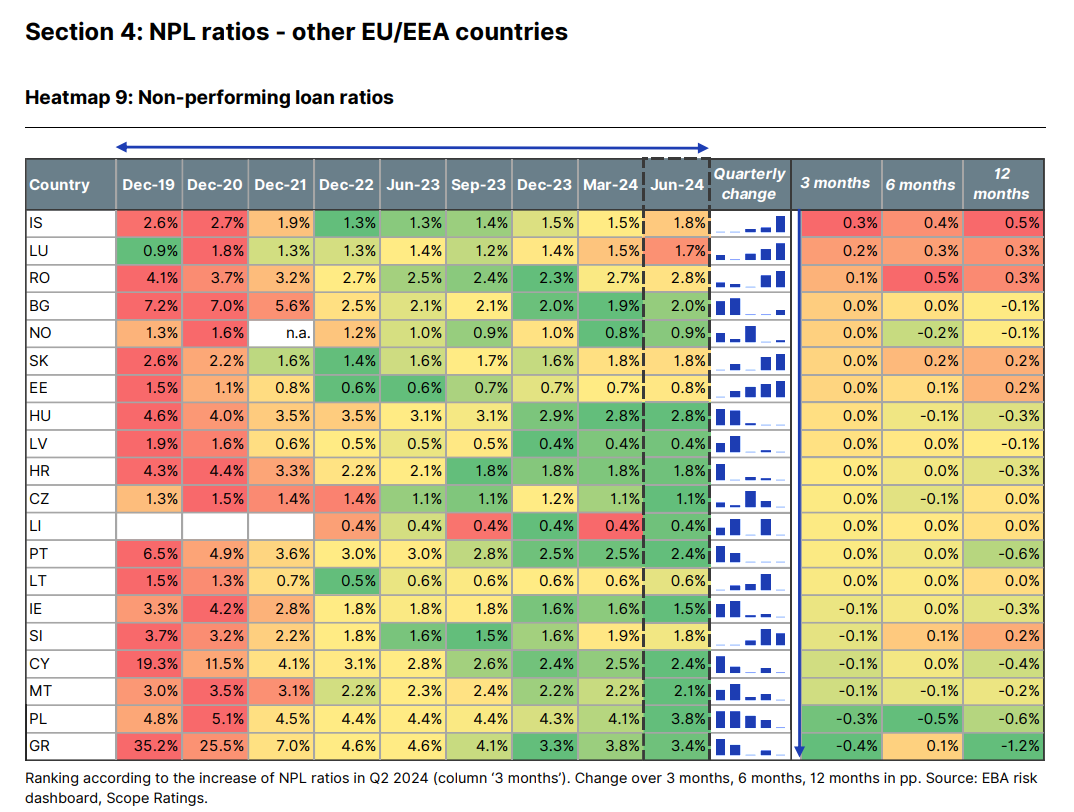 Η Ελλάδα, αλλά και η Πολωνία, είναι από τις χώρες που ξεχώρισε θετικά, με τις ελληνικές τράπεζες να συνεχίζουν τη μείωση των μη εξυπηρετούμενων δανείων τους, αν και οι δείκτες μη εξυπηρετούμενων δανείων στις χώρες αυτές παραμένουν υψηλότεροι από τον μέσο όρο της ΕΕ