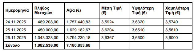 H ΑΛΦΑ ΤΡΑΠΕΖΑ (η ‘Τράπεζα’), σε συνέχεια της από 17.09.2025 ανακοίνωσής της, ενημερώνει ότι, στο Πλαίσιο του Προγράμματος Αγοράς Ιδίων Μετοχών που εγκρίθηκε με την απόφαση της Έκτακτης Γενικής Συνέλευσης των Μετόχων της με ημερομηνία 12.6.2025, κατά το διάστημα 24.11.2025 – 26.11.2025, προέβη σε αγορά μέσω του Χρηματιστηρίου Αθηνών συνολικά 1.982.536 ίδιων μετοχών, με μέση τιμή κτήσης 3,6221 € ανά μετοχή και συνολικό κόστος 7.180.853,68 €.
