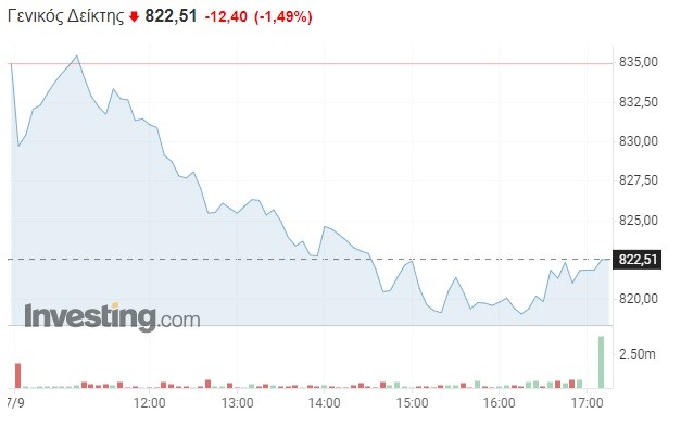 Σε χαμηλότερο σημείο του τελευταίου 1,5 μήνα διολίσθησε το Χρηματιστήριο Αθηνών, καθώς ούτε οι ισχυρές επιδόσεις της ελληνικής οικονομίας στο β’ τρίμηνο κατάφεραν να βάλουν ένα «stop» στις κλιμακούμενες ρευστοποιήσεις, οι οποίες έχουν αισίως οδηγήσει την αγορά στη ζώνη των 820 μονάδων.