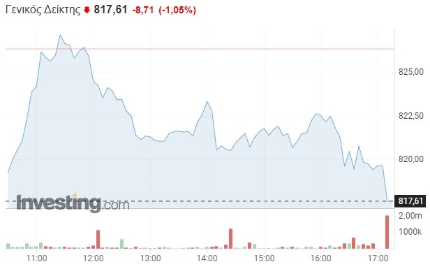Πιο συγκεκριμένα, ο Γενικός Δείκτης σημείωσε ελεγχόμενη πτώση κατά 1,05% και διαμορφώθηκε στις 817,61 μονάδες, χάνοντας σχεδόν εννέα μονάδες σε σχέση με το κλείσιμο της Τετάρτης (826,32 μονάδες). Το τόξο των ημερήσιων διακυμάνσεων καθορίστηκε σε 10 μονάδες (από 817,55 έως 827,12 μονάδες), με τον τζίρο των συναλλαγών να μην υπερβαίνει τα 48 εκατομμύρια ευρώ.