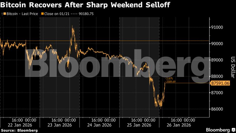 Το μεγαλύτερο κρυπτονόμισμα υποχώρησε έως και 3,5% την Κυριακή, αγγίζοντας χαμηλό για το 2026 λίγο πάνω από τα 86.000 δολάρια, πριν ανακάμψει στα 87.733 δολάρια το πρωί της Δευτέρας στη Σιγκαπούρη. Το δεύτερο μεγαλύτερο token, το Ether, κατέγραψε απώλειες έως 5,7%, πριν ενισχυθεί κατά 2% στα 2.872 δολάρια, παραμένοντας ωστόσο κοντά στο χαμηλότερο επίπεδο από τα μέσα Δεκεμβρίου.