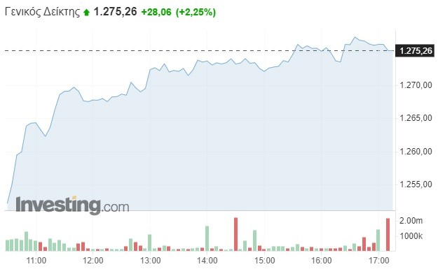 Πιο αναλυτικά, ο Γενικός Δείκτης σημείωσε ισχυρή άνοδο κατά 2,25% και διαμορφώθηκε στις 1.275,26 μονάδες, κερδίζοντας 28 μονάδες σε σχέση με το κλείσιμο της Τετάρτης (1.247,20 μονάδες). Το τόξο των ημερήσιων διακυμάνσεων καθορίστηκε σε 26 μονάδες (από 1.251,42 έως 1.277,37 μονάδες), με τον τζίρο των συναλλαγών να κυμαίνεται στα 114,2 εκατ. ευρώ.