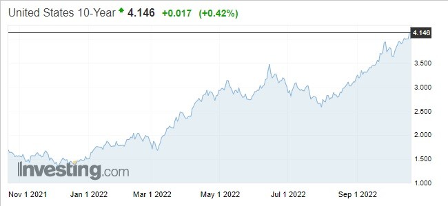 Στο Ηνωμένο Βασίλειο, το οποίο ανεβαίνει τον δικό του «Γολγοθά», η απόδοση του 10ετούς ομολόγου αυξάνεται κατά 4 μονάδες βάσης και ανέρχεται στο 3,913%, παραμένοντας σε απόσταση αναπνοής από το υψηλότερο επίπεδο της τελευταίας 14ετίας (4,5%). Όσον αφορά τις ΗΠΑ, παράλληλα, η απόδοση του 10ετούς τίτλου εκτινάσσεται στο 4,146%, ένα επίπεδο το οποίο παραπέμπει στην εποχή της Μεγάλης Ύφεσης του 2008-9.