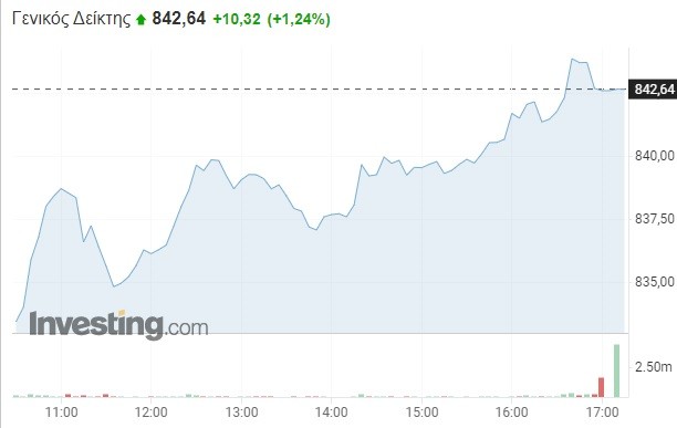 Πιο συγκεκριμένα, ο Γενικός Δείκτης σημείωσε δυναμική άνοδο κατά 1,24% και διαμορφώθηκε στις 842,64 μονάδες, κερδίζοντας τουλάχιστον 10 μονάδες σε σχέση με το κλείσιμο της Παρασκευής (832,32 μονάδες). Το τόξο των ημερήσιων διακυμάνσεων καθορίστηκε σε 11 μονάδες (από 832,84 έως 843,99 μονάδες), με τον τζίρο των συναλλαγών να κυμαίνεται σε 62 εκατομμύρια ευρώ.
