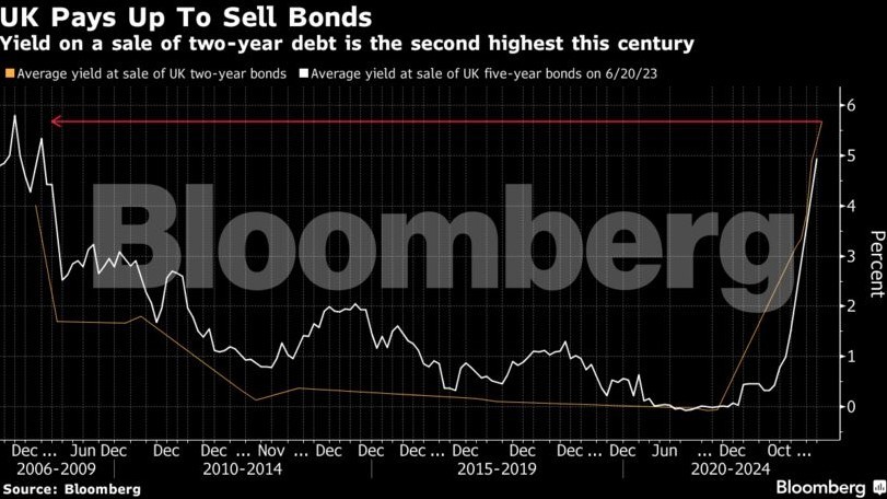 Στα υψηλότερα επίπεδα εδώ και 25 χρόνια εκτοξεύτηκε το κόστος δανεισμού των 2ετών βρετανικών ομολόγων, στο πλαίσιο νέας δημοπρασίας ύψους 4 δισ. στερλίνων που διενήργησε η χώρα.
