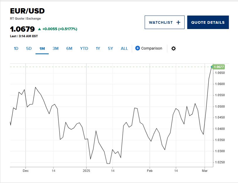 Η ισοτιμία ευρώ/δολαρίου σημείωσε άνοδο άνω των 2 αμερικανικών σεντς τις δύο τελευταίες ημέρες διαπραγμάτευσης, παράλληλα με τα ιστορικά υψηλά όλων των εποχών στο ευρωπαϊκό χρηματιστήριο, υποδηλώνοντας την αυξανόμενη εμπιστοσύνη των επενδυτών στις οικονομικές προοπτικές του μπλοκ εν μέσω σχεδίων ενίσχυσης των αμυντικών δαπανών. Η πιθανή αλλαγή δημοσιονομικής πολιτικής της Γερμανίας ενίσχυσε περαιτέρω την αισιοδοξία για την οικονομική ανάκαμψη της χώρας.