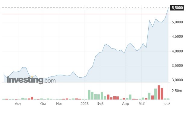 Συγκεκριμένα, κατά τη διάρκεια της συνεδρίασης της Τρίτης, ο τίτλος της εισηγμένης κάνει μίνι ράλι άνω του 4% και διαμορφώνεται στα 5,5 ευρώ, τα οποία αποτελούν ρεκόρ 5,5 ετών.