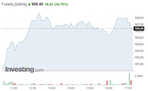Πιο συγκεκριμένα, κατά τη διάρκεια της Τετάρτης, ο Γενικός Δείκτης σημείωσε άνοδο κατά 0,70% και διαμορφώθηκε στις 906,40 μονάδες, κερδίζοντας σχεδόν 6,5 μονάδες σε σχέση με το κλείσιμο της Τρίτης (900,07 μονάδες). Το τόξο των ημερήσιων διακυμάνσεων καθορίστηκε σε οκτώ μονάδες (από 900,30 έως 908,79 μονάδες), με τον τζίρο των συναλλαγών να κυμαίνεται στα 66,5 εκατομμύρια ευρώ.