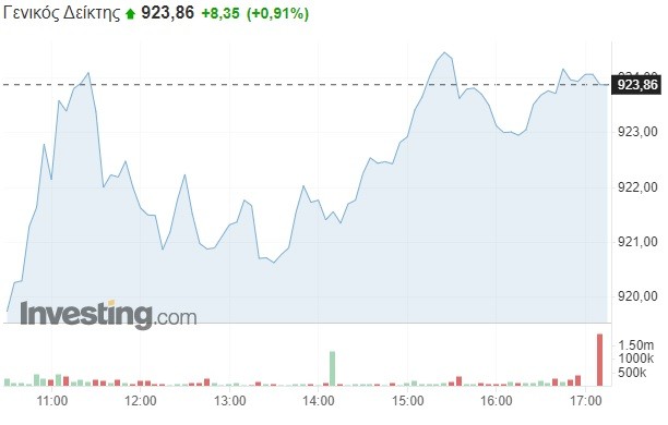Πιο συγκεκριμένα, κατά τη διάρκεια της Τετάρτης, ο Γενικός Δείκτης σημείωσε αισθητή άνοδο κατά 0,91% και διαμορφώθηκε στις 923,86 μονάδες, κερδίζοντας σχεδόν 8,5 μονάδες σε σχέση με το κλείσιμο της Τρίτης (915,51 μονάδες). Το τόξο των ημερήσιων διακυμάνσεων καθορίστηκε σε επτά μονάδες (από 917,34 έως 924,46 μονάδες), με τον τζίρο των συναλλαγών να κυμαίνεται στα 43 εκατομμύρια ευρώ.