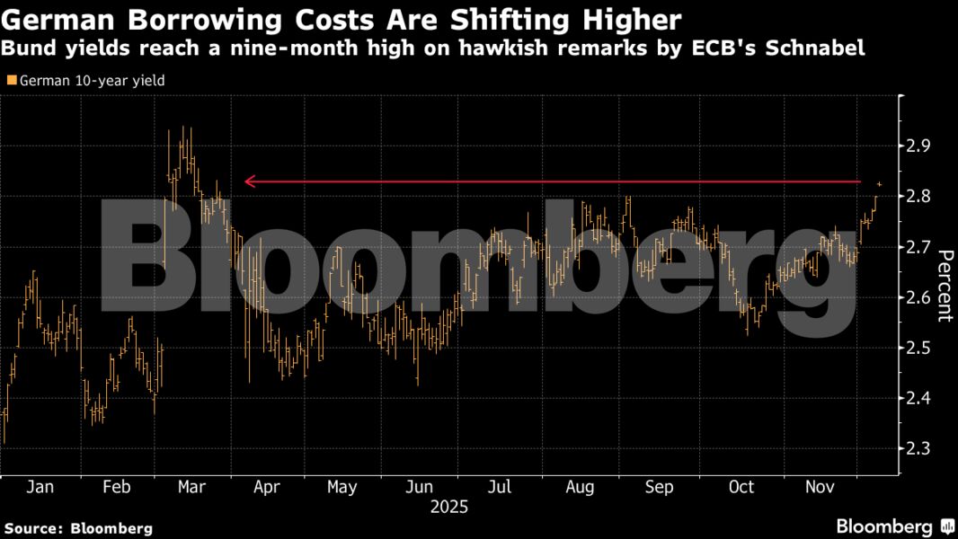 «Οι αποδόσεις των Bund αγγίζουν κρίσιμα επίπεδα, κάτι που ενισχύθηκε από τις δηλώσεις της Σνάμπελ σήμερα το πρωί», έγραψε ο στρατηγικός αναλυτής της Commerzbank , Χάουκε Ζιμσεν, σε σημείωμά τους προς πελάτες. Τα γερμανικά ομόλογα υστερούν έναντι των διεθνών ομολόγων από τότε που η γερμανική κυβέρνηση παρουσίασε το ιστορικό της σχέδιο για την αξιοποίηση εκατοντάδων δισεκατομμυρίων ευρώ σε άμυνα και υποδομές — εξέλιξη που προκάλεσε τον εντονότερο «sell-off» ομολόγων των τελευταίων 35 ετών τον Μάρτιο. Παρότι η κατάσταση εξομαλύνθηκε τους επόμενους μήνες, οι ανησυχίες επέστρεψαν μετά την έγκριση του προϋπολογισμού του 2026, που περιλαμβάνει 98 δισ. ευρώ καθαρό νέο ομοσπονδιακό δανεισμό.