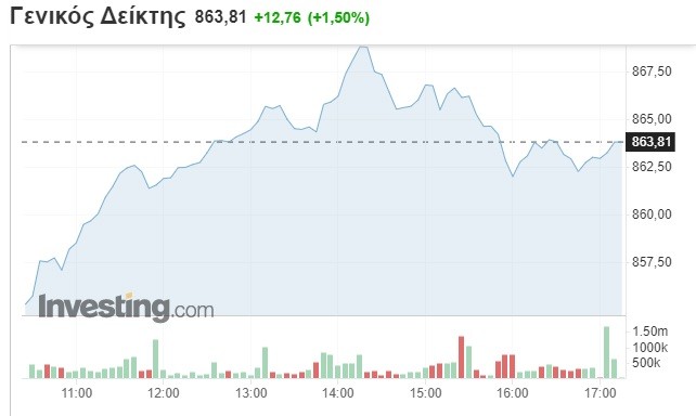 Πιο συγκεκριμένα, ο Γενικός Δείκτης σημείωσε αξιοσημείωτη άνοδο κατά 1,50% και διαμορφώθηκε στις 863,81 μονάδες (υψηλό 2μήνου) κερδίζοντας περισσότερες από 12,5 μονάδες σε σχέση με το κλείσιμο της Παρασκευής (851,05 μονάδες). Το τόξο των ημερήσιων διακυμάνσεων καθορίστηκε σε 14 μονάδες (από 854,56 έως 868,90 μονάδες), με τον τζίρο των συναλλαγών να κυμαίνεται στα 60 εκατ. ευρώ.