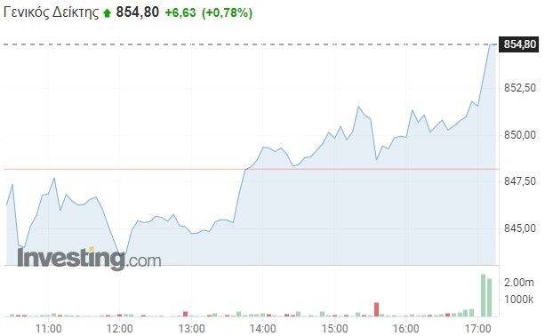 Πιο συγκεκριμένα, ο Γενικός Δείκτης σημείωσε επιφυλακτική άνοδο κατά 0,78% και διαμορφώθηκε στις 854,80 μονάδες, κερδίζοντας τουλάχιστον 6,5 μονάδες σε σχέση με το κλείσιμο της Τετάρτης (848,17 μονάδες). Το τόξο των ημερήσιων διακυμάνσεων καθορίστηκε σε 11 μονάδες (από 843,33 έως 854,80 μονάδες), με τον τζίρο των συναλλαγών να κυμαίνεται μόλις στα 46 εκατομμύρια ευρώ.