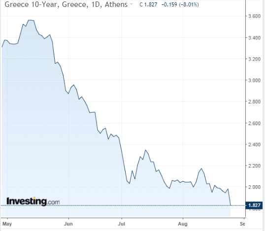 Συγκεκριμένα, το ελληνικό 10ετές υποχωρεί κατά 7 μονάδες βάσεις με την απόδοση στο ιστορικό χαμηλό του 1,82%.