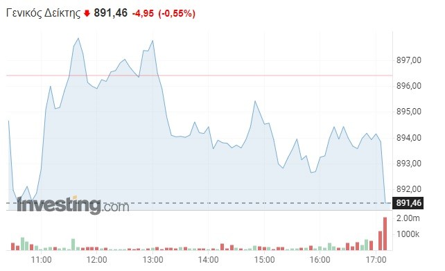Πιο συγκεκριμένα, ο Γενικός Δείκτης κατέγραψε ελεγχόμενη πτώση κατά 0,55% και διαμορφώθηκε στις 891,46 μονάδες, χάνοντας περίπου πέντε μονάδες σε σχέση με το κλείσιμο της Δευτέρας (896,41 μονάδες). Το τόξο των ημερήσιων διακυμάνσεων καθορίστηκε σε έξι μονάδες (από 891,05 έως 897,99 μονάδες), με τον τζίρο των συναλλαγών να κυμαίνεται στα 52 εκατ. ευρώ.