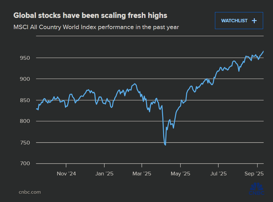 Ο δείκτης MSCI All Country World Index, ο οποίος παρακολουθεί την απόδοση περισσότερων από 2.500 μετοχών από ανεπτυγμένες και αναδυόμενες αγορές, έχει σημειώσει νέα ρεκόρ για τέσσερις συνεχόμενες συνεδρίες, σύμφωνα με στοιχεία της LSEG.