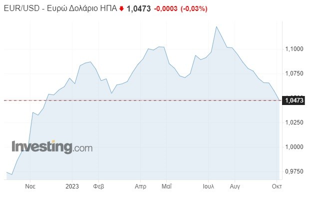 Ακριβώς αντίρροπη είναι η πορεία του δολαρίου, καθώς η ανθεκτική αμερικανική οικονομία και η πρόθεση της Federal Reserve να αυξήσει περαιτέρω τα επιτόκια (σήμερα βρίσκονται στο 5,25% – 5,50%) οδηγούν το δολάριο στο υψηλότερο σημείο του τελευταίου 10μήνου.