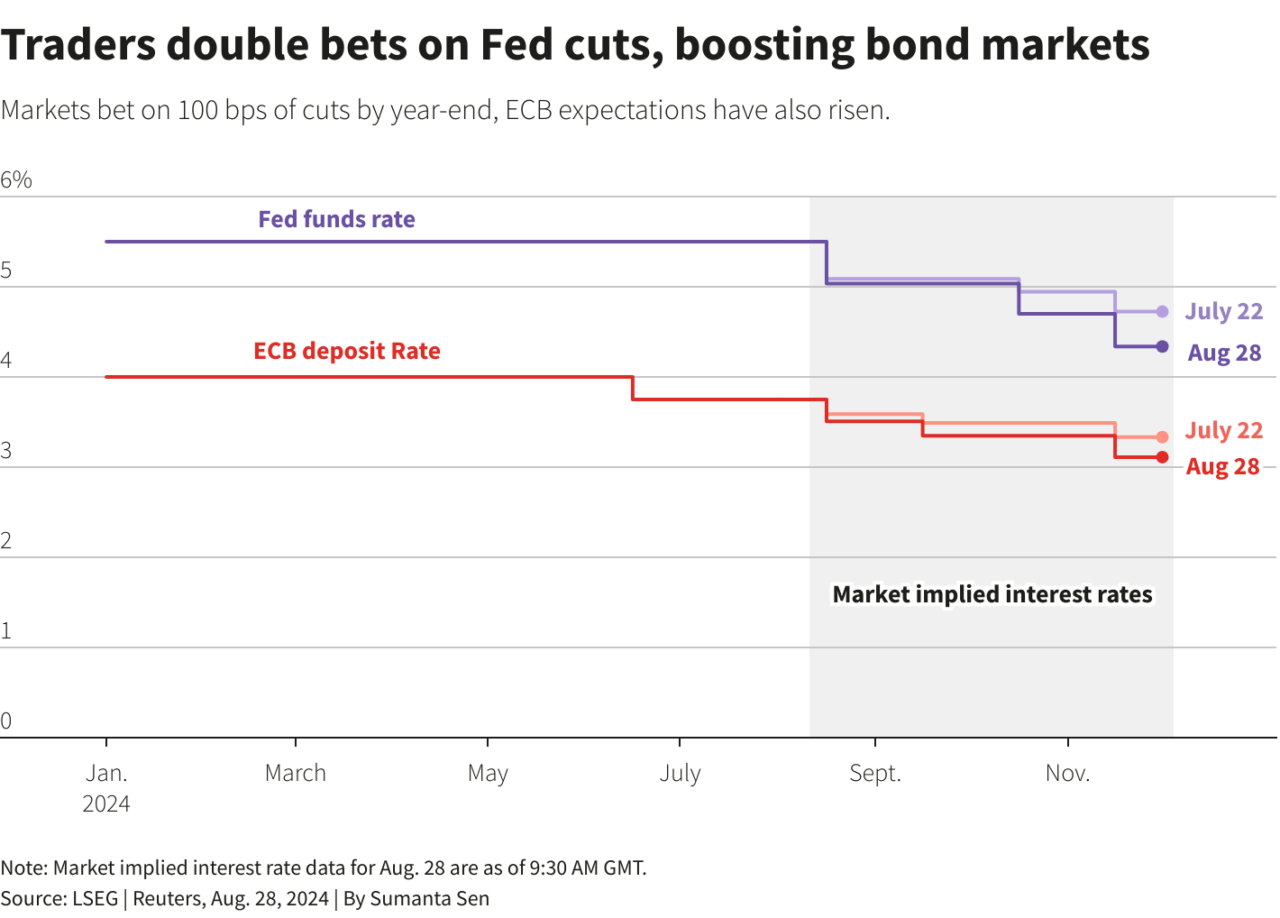 Οι αγορές κρατικών ομολόγων, οι οποίες απόλαυσαν ένα καλοκαίρι με σταθερά κέρδη, αναμετρώνται τώρα με τα στοιχήματα των αγορών για ταχείες μειώσεις των επιτοκίων των κεντρικών τραπεζών και επιβράδυνση του πληθωρισμού, όπως και τις προεδρικές εκλογές στις ΗΠΑ.