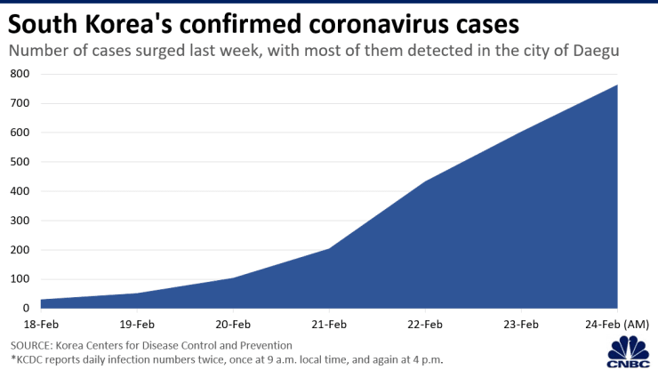 Πάνω από 760 άτομα έχουν μολυνθεί, με την πλειοψηφία των κρουσμάτων να καταγράφεται τα τελευταία 24ωρα. Τώρα με το νέο επίπεδο συναγερμού, η κυβέρνηση έχει τη δικαιοδοσία να διατάξει το κλείσιμο των σχολείων, τη διακοπή των δημόσιων μεταφορών και την ακύρωση των πτήσεων από και προς τη Νότια Κορέα.