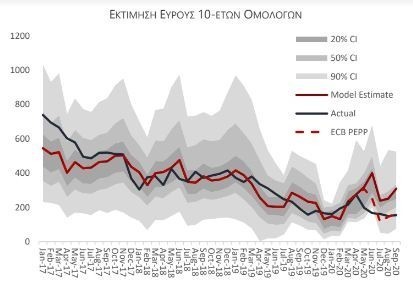 Συγκεκριμένα, το εύρος επιτοκίων (spread) της ελληνικής 10ετίας αυξήθηκε τον Σεπτέμβριο κατά 5 μβ στις 154 μβ σε σχέση με τα τέλη Αυγούστου. Θα πρέπει να τονιστεί ωστόσο ότι παρά την σχετική επιδείνωση των θεμελιωδών μεγεθών της ελληνικής οικονομίας σε σχέση με την γερμανική, η ελληνική αγορά ομολόγων εμφανίζει μια αποσύνδεση από τις αποτιμήσεις του στατιστικού μοντέλου που στηρίζεται στα θεμελιώδη των δυο χωρών λόγω του θετικού πριμ από το πρόγραμμα PEPP της Ευρωπαϊκής Κεντρικής Τράπεζας (ΕΚΤ). Ενδεικτικά η εκτίμηση για μια «δίκαιη» του spread αυξήθηκε στις 309 μβ στα τέλη Σεπτεμβρίου, αν δεν ληφθεί υπόψη η αγορά ομολόγων από την ΕΚΤ, ενώ το πρόγραμμά PEPP εκτιμάται ότι έχει ωθήσει την τρέχουσα αποτίμηση έως και 147 μβ χαμηλότερα στις 162 μβ.