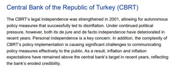 Εν τω μεταξύ η Ευρωπαϊκή Κεντρική Τράπεζα δημοσίευσε αξιολογηση κόλαφο για την ανεξαρτησία της κεντρικής τράπεζας της Τουρκίας – και πιο συγκεκριμένα την έλλειψή της.