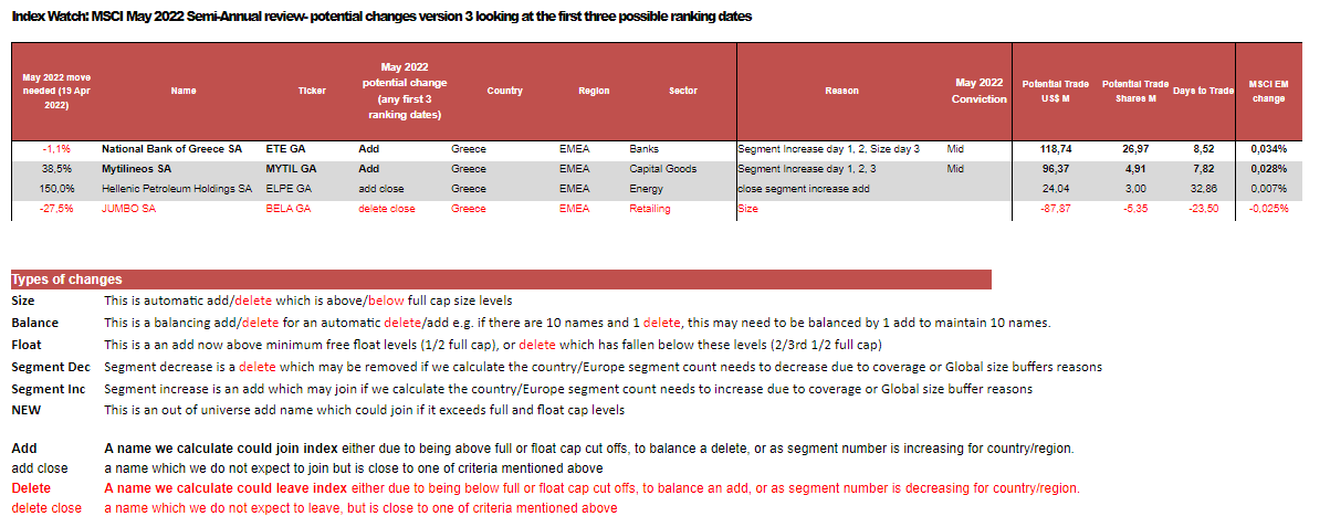Επισημαίνεται ότι η MSCI. θα ανακοινώσει τις όποιες αλλαγές της εξαμηνιαίας αναδιάρθρωσης των δεικτών την Πέμπτη 12 Μαΐου και οι όποιες αλλαγές θα τεθούν σε εφαρμογή στο κλείσιμο της αγοράς στις 31 Μαΐου.