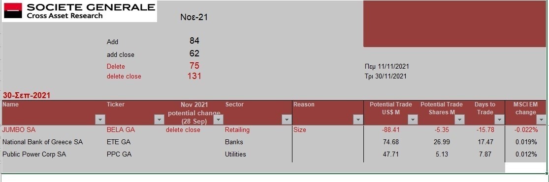 Η γαλλική Société Générale εκτιμά ότι η αναδιάρθρωση των δεικτών της MSCI τον επόμενο μήνα θα έχει έντονο ελληνικό ενδιαφέρον αφού προβλέπει ότι θα υπάρξουν δύο προσθήκες και μια διαγραφή από τον εγχώριο δείκτη MSCI Greece και συναλλαγές αξίας που ξεπερνούν τα 200 εκατ. δολάρια σε μία μόνο συνεδρίαση!