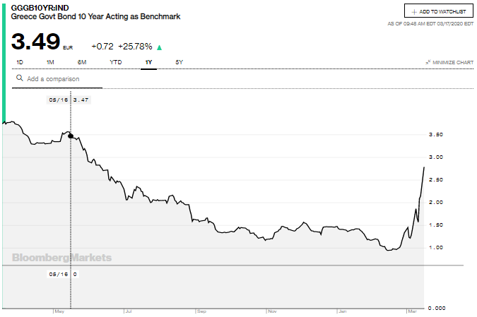 Η αποκλιμάκωση των αποδόσεων των ελληνικών ομολόγων διήρκησε λίγο καθώς η νέα παγκόσμια κρίση λόγω κορωνοϊού έχει επαναφέρει την ανασφάλεια στους επενδυτές οι οποίοι πωλούν οτιδήποτε θεωρούν ότι ενέχει ρίσκο.