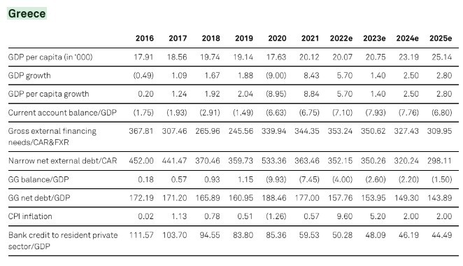 «Μετά από ένα σταθερό 2022, αναμένουμε ότι η ελληνική οικονομία θα επιβραδυνθεί το 2023, με την αύξηση του πραγματικού ΑΕΠ να προβλέπεται σε περίπου 1,4%. Παρ’ όλα αυτά, αναμένουμε ότι οι οικονομικές επιδόσεις της Ελλάδας θα ξεπεράσουν το μέσο όρο της Ευρωζώνης, εν μέρει λόγω του μικρότερου μεριδίου της ενέργειας και των επιτοκίων ευαίσθητων τομέων στην οικονομία της», εξηγεί η S&P Global Ratings.