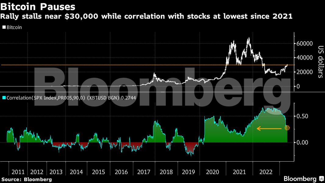 Η ανάκαμψη του Bitcoin το 2023 έχει σταματήσει γύρω από το επίπεδο των 30.000 δολαρίων, με την πορεία του να ανακόπτεται λόγω των πρόσφατων προσπαθειών ρύθμισης της αγορά στις ΗΠΑ αλλά και της πιο νηφάλιας εκτίμησης των προοπτικών της νομισματικής πολιτικής της Ομοσπονδιακής Τράπεζας των ΗΠΑ (Fed).
