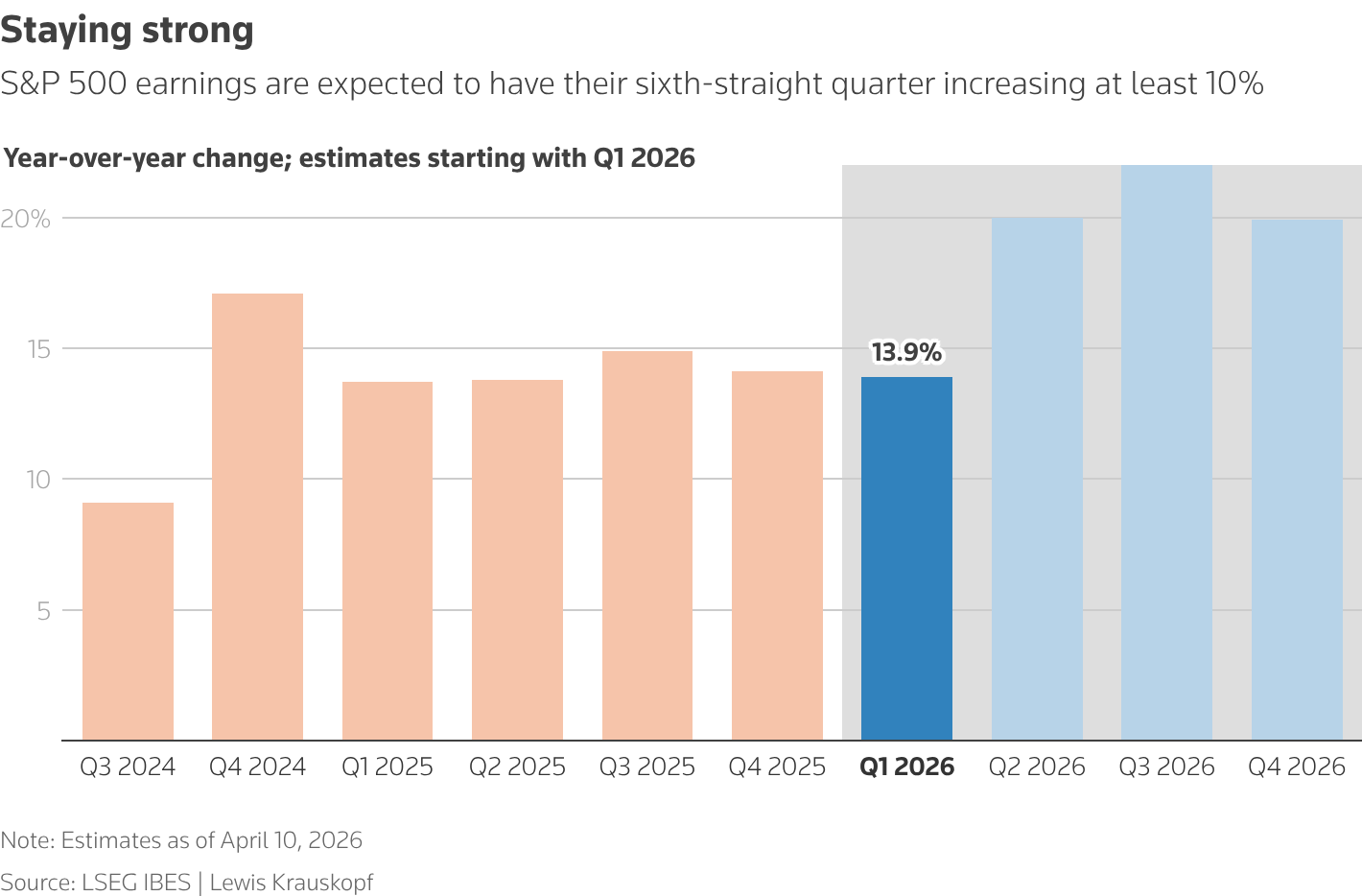 Ένας θετικός παράγοντας για τις μετοχές από την έναρξη του πολέμου είναι το γεγονός ότι οι εκτιμήσεις για τα εταιρικά κέρδη στις ΗΠΑ είναι ακόμη πιο ισχυρές. Οι εταιρείες του S&P 500 αναμένεται να αυξήσουν τα κέρδη τους κατά 19% το 2026, από την αναμενόμενη αύξηση 15% λίγο πριν την έναρξη του πολέμου, σύμφωνα με το LSEG IBES.