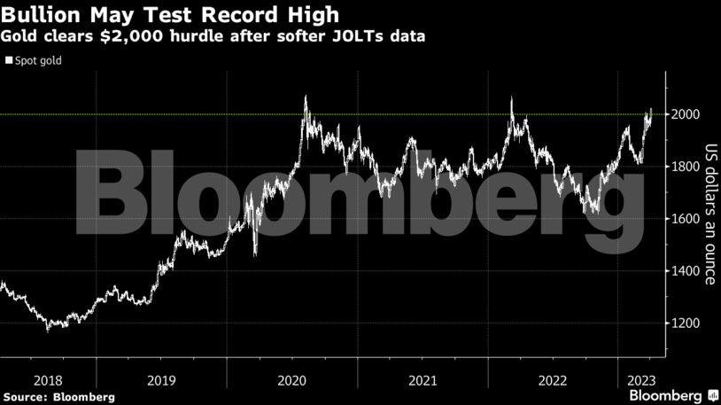 Το πολύτιμο μέταλλο την Τρίτη έκλεισε πάνω από το όριο των 2.000 δολαρίων ανά ουγγιά για πρώτη φορά από τον Μάρτιο του 2022 μετά τα στοιχεία που έδειξαν ότι οι κενές θέσεις εργασίας στις ΗΠΑ μειώθηκαν τον Φεβρουάριο στο χαμηλότερο σημείο από τον Μάρτιο του 2021.