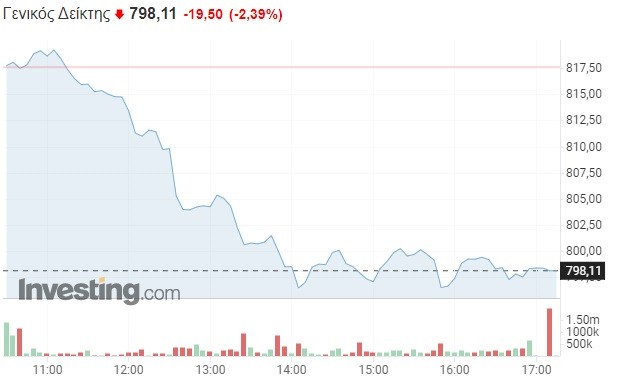 Πιο αναλυτικά, στο ελληνικό χρηματιστήριο, ο Γενικός Δείκτης σημείωσε ισχυρή πτώση κατά 2,39% και διαμορφώθηκε στις 798,11 μονάδες, χάνοντας 19,5 μονάδες σε σχέση με το κλείσιμο της Πέμπτης (817,61 μονάδες). Το τόξο των ημερήσιων διακυμάνσεων καθορίστηκε σε 24 μονάδες (από 795,76 έως 819,59 μονάδες), με τον τζίρο των συναλλαγών να κυμαίνεται κοντά στα 61 εκατομμύρια ευρώ.