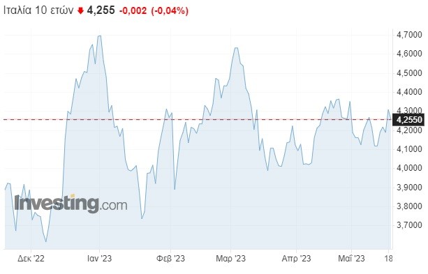 Την ίδια στιγμή, η απόδοση του 10ετούς ομολόγου της Ιταλίας, η οποία απολαμβάνει τα οφέλη της «επενδυτικής βαθμίδας» με βάση και τους τρεις μεγάλους οίκους αξιολόγησης, κινείται σε υψηλότερα επίπεδα σε σχέση με την Ελλάδα, καθώς διαμορφώνεται στο 4,25% (spreads 180 μονάδες βάσης).