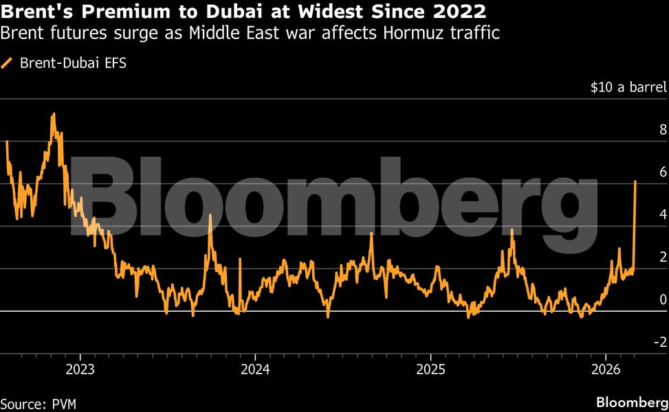 Τα συμβόλαια μελλοντικής εκπλήρωσης του Brent διαπραγματεύονται με το μεγαλύτερο premium έναντι του δείκτη Dubai της Μέσης Ανατολής από το 2022, μετά την εκτίναξη του παγκόσμιου benchmark αργού πετρελαίου στον απόηχο των επιθέσεων των ΗΠΑ και του Ισραήλ κατά του Ιράν.