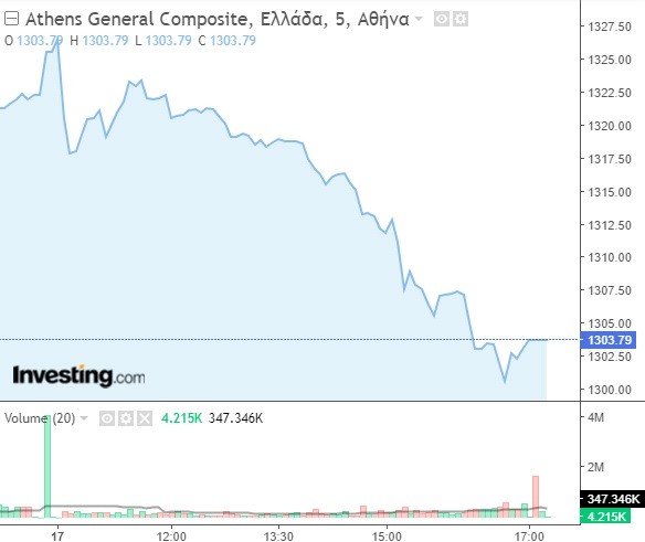 Πιο αναλυτικά, ο Γενικός Δείκτης σημείωσε αξιοσημείωτη πτώση κατά 1,65% και διαμορφώθηκε στις 1.303,79 μονάδες, χάνοντας σχεδόν 22 μονάδες σε σχέση με το κλείσιμο της Παρασκευής (1.325,61 μονάδες). Το τόξο των ημερήσιων διακυμάνσεων καθορίστηκε σε 26 μονάδες (από 1.300,70 έως 1.326,55 μονάδες), με τον τζίρο των συναλλαγών να κυμαίνεται στα 76,1 εκατ. ευρώ.