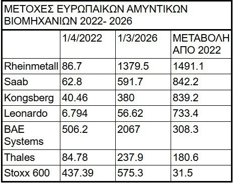 Η συγκριτική απόδοση του STOXX 600, που δίνει τη συνολική εικόνα των ευρωπαϊκών μετοχών όλων των κλάδων, είναι αποκαλυπτική: ενώ ο δείκτης ανεβαίνει από τις 437,39 στις 575,3 μονάδες, μόλις +31,5 %, οι αμυντικές μετοχές «πετούν» σε επίπεδα έξι έως δεκαπέντε φορές μεγαλύτερα.
