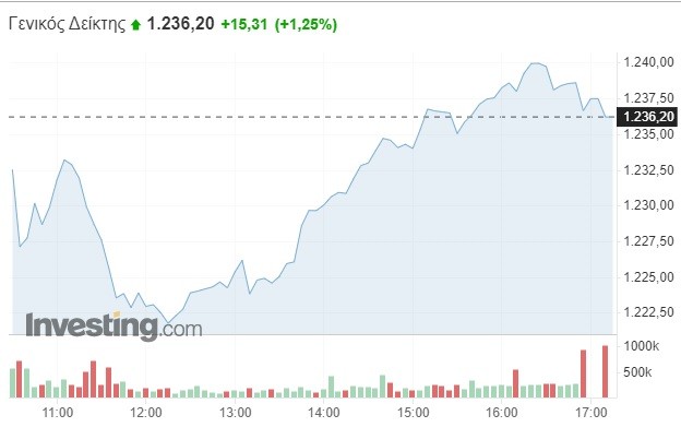 Πιο αναλυτικά, ο Γενικός Δείκτης σημείωσε αξιοσημείωτη άνοδο κατά 1,25% και διαμορφώθηκε στις 1.236,20 μονάδες, κερδίζοντας σχεδόν 15,5 μονάδες σε σχέση με το κλείσιμο της Παρασκευής (1.220,89 μονάδες). Το τόξο των ημερήσιων διακυμάνσεων καθορίστηκε σε 20 μονάδες (από 1.220,99 έως 1.240,22 μονάδες), με τον τζίρο των συναλλαγών να κυμαίνεται στα 94,2 εκατ. ευρώ.