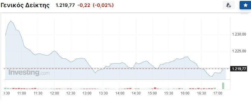 Πιο αναλυτικά, ο Γενικός Δείκτης σημείωσε ανεπαίσθητη πτώση κατά 0,02% και διαμορφώθηκε στις 1.219,77 μονάδες, χάνοντας λιγότερο από μισή μονάδα σε σχέση με το κλείσιμο της Πέμπτης (1.219,99 μονάδες). Το τόξο των ημερήσιων διακυμάνσεων καθορίστηκε σε 17 μονάδες (1.217,25 έως 1.234,54 μονάδες), με τον τζίρο των συναλλαγών να κυμαίνεται στα 86 εκατ. ευρώ.