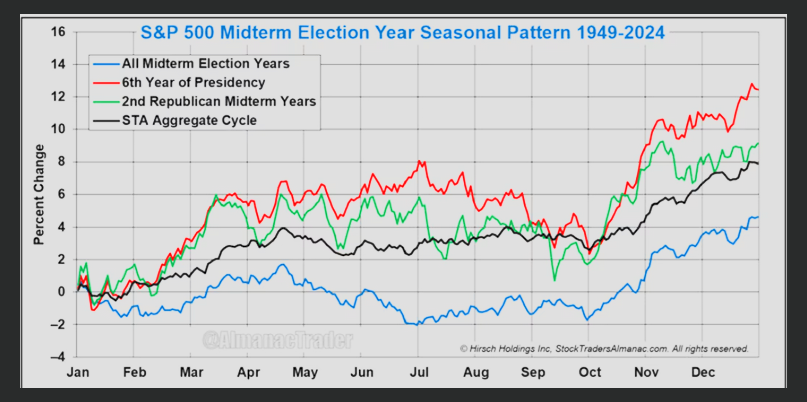 Ιστορικά, η απόδοση των χρηματιστηριακών αγορών σε έτη ενδιάμεσων εκλογών, ή το δεύτερο έτος μιας προεδρικής θητείας, τείνει να είναι η πιο αδύναμη σε έναν τετραετή κύκλο προεδρικής θητείας.