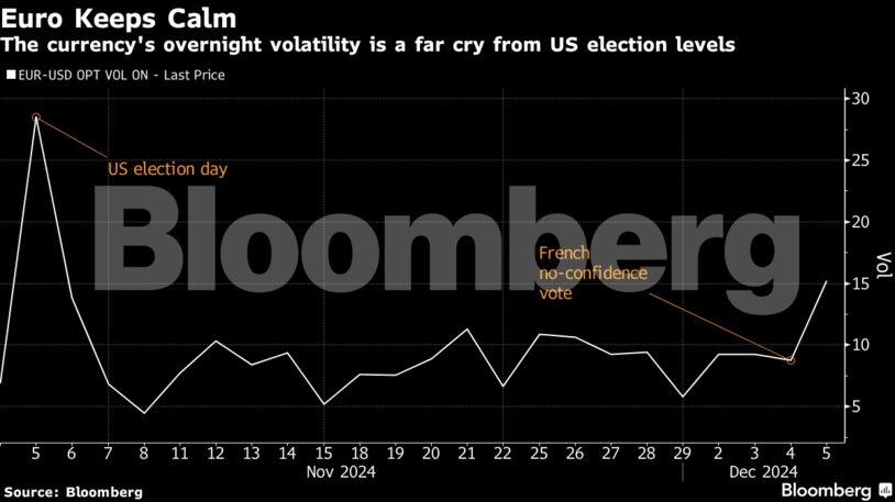 Οι έμποροι σταθμίζουν την πορεία του κοινού νομίσματος μετά τη διαμάχη για τον προϋπολογισμό του επόμενου έτους που οδήγησε την ακροδεξιά ηγέτιδα Μαρίν Λεπέν και έναν αριστερό συνασπισμό να πάνε σε πρόταση δυσπιστίας κατά της κυβέρνησης του πρωθυπουργού Μισέλ Μπαρνιέ.