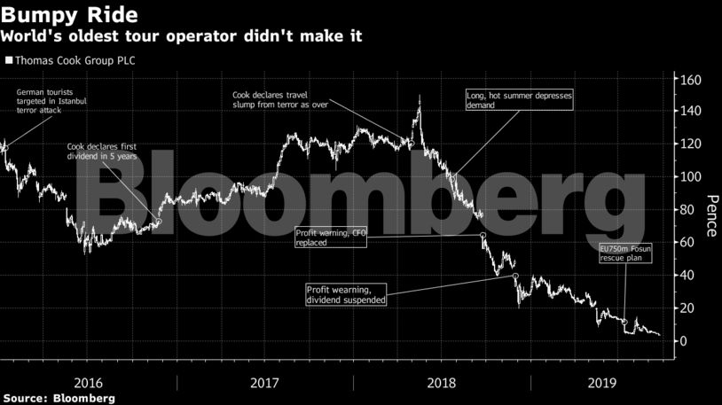 Η Thomas Cook Group Plc κατέρρευσε υπό την πίεση του τεράστιου χρέους της, μετά από την αποτυχία των συνομιλιών με τους πιστωτές, αναγκάζοντας τη βρετανική κυβέρνηση να μισθώσει αεροπλάνα για να μεταφέρει πίσω περισσότερους από 150.000 από τους πελάτες της εταιρείας.