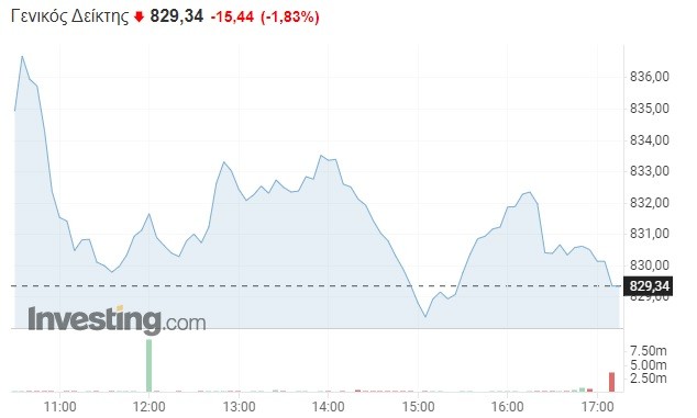 Πιο συγκεκριμένα, ο Γενικός Δείκτης σημείωσε αισθητή πτώση κατά 1,83% και διαμορφώθηκε στις 829,34 μονάδες, χάνοντας σχεδόν 15,5 μονάδες σε σχέση με το κλείσιμο της Παρασκευής. Το τόξο των ημερήσιων διακυμάνσεων καθορίστηκε σε 10 μονάδες (από 828,13 έως 838,82 μονάδες), με τον τζίρο των συναλλαγών να κυμαίνεται στα 70 εκατομμύρια ευρώ.