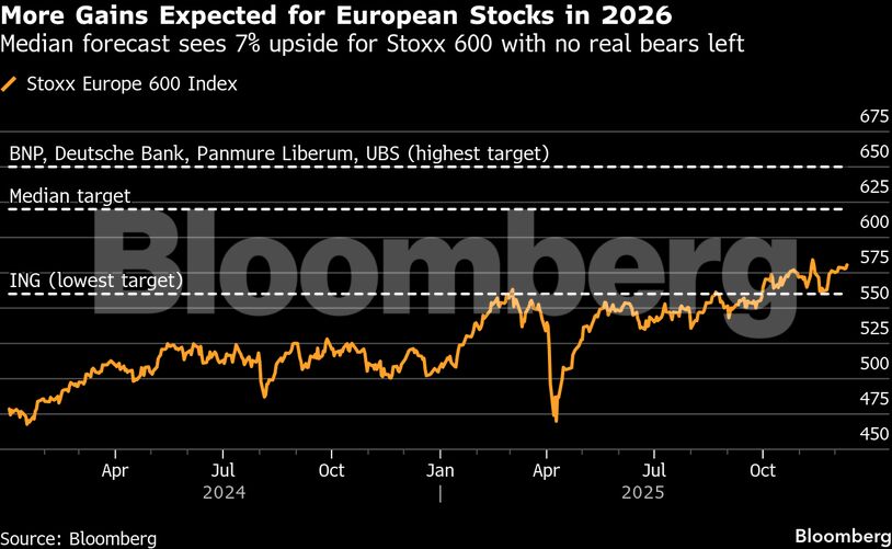 Για πρώτη φορά μέσα σε οκτώ χρόνια, οι αναλυτές της αγοράς κάνουν μια τολμηρή πρόβλεψη για την Ευρώπη: κανένας από τους στρατηγικούς αναλυτές που συμμετείχαν στην έρευνα του Bloomberg δεν προβλέπει σημαντική πτώση της χρηματιστηριακής αγοράς το 2026.