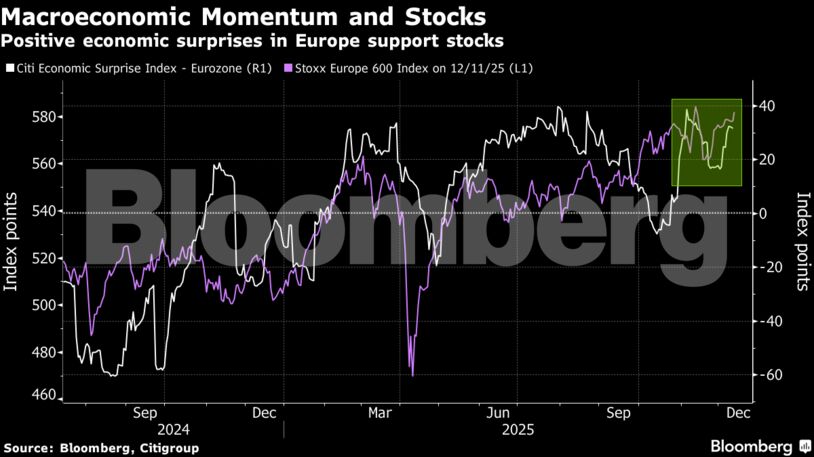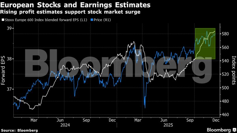 Οι μετοχές της περιοχής είχαν μια ισχυρή πορεία το 2025, με τον Stoxx 600 να σημειώνει άνοδο 15% και να βρίσκεται σε τροχιά για τρίτη συνεχόμενη χρονιά κερδών. Οι μετοχές επωφελήθηκαν από το ενδιαφέρον των επενδυτών που αναζητούσαν διαφοροποίηση εκτός των ΗΠΑ, προσελκύοντας χαμηλότερες αποτιμήσεις, πιο διαλλακτική νομισματική πολιτική και την υπόσχεση αυξημένων κρατικών δαπανών.