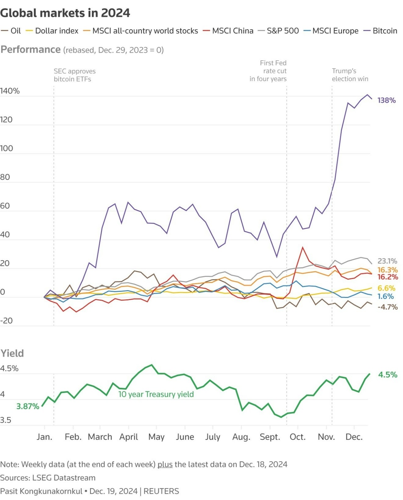 Αυτό λαμβάνει χώρα κυρίως χάρη στη δεύτερη χρονιά τεράστιων κερδών για τις μετοχές της Wall Street, καθώς ο πυρετός της τεχνητής νοημοσύνης και η ισχυρή οικονομική ανάπτυξη απορρόφησαν περισσότερα παγκόσμια κεφάλαια και τόνωσαν το δολάριο κατά 7% έναντι των ομολόγων του το 2024.