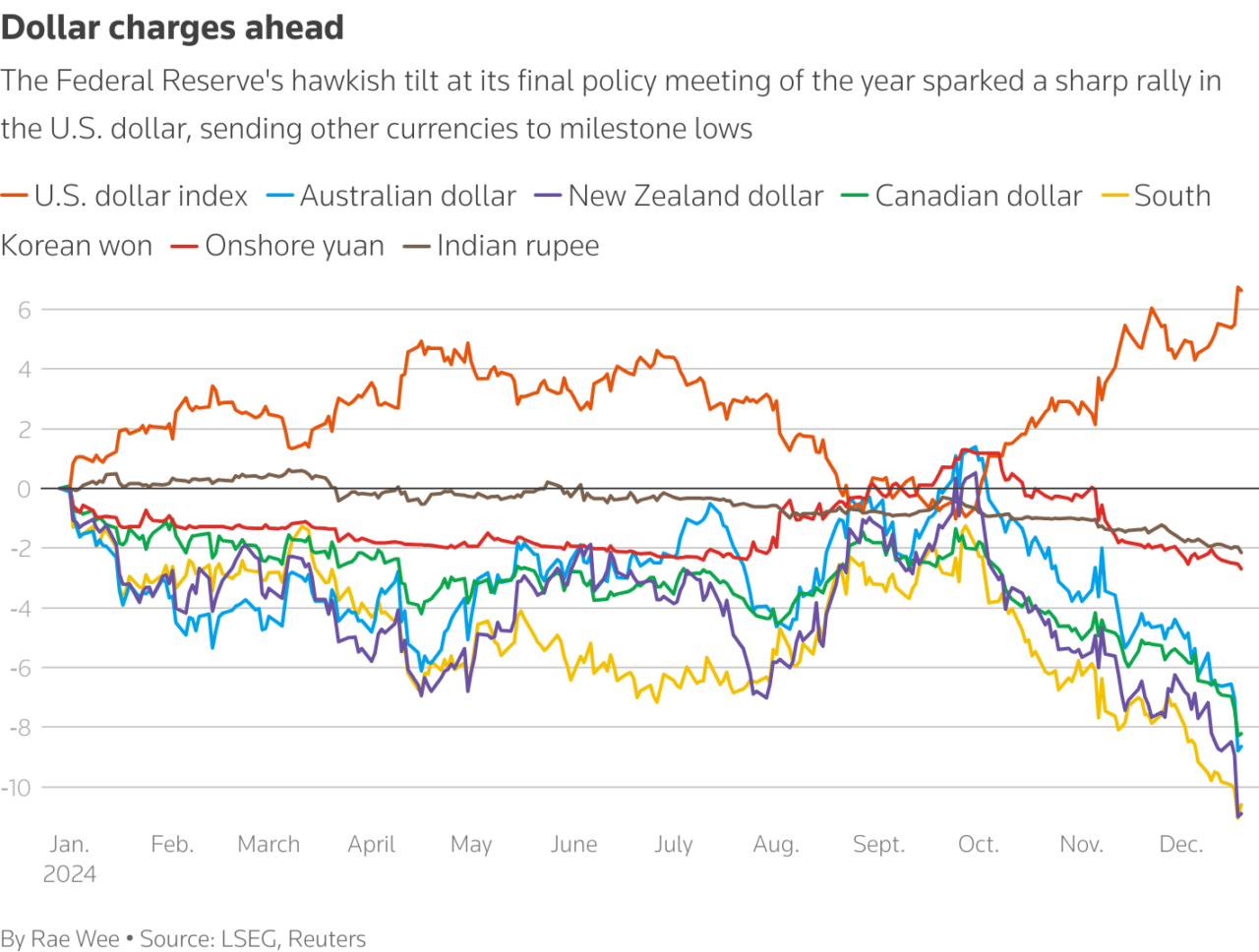 Η επιφυλακτική κλίση της Ομοσπονδιακής Τράπεζας των ΗΠΑ στην τελευταία συνεδρίαση πολιτικής της για το έτος προκάλεσε απότομο ράλι στο δολάριο ΗΠΑ, στέλνοντας άλλα νομίσματα σε ρεκόρ-χαμηλά.