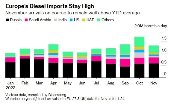 Είναι χαρακτηριστικό ότι, σύμφωνα με στοιχεία της Vortexa, στις 24 πρώτες ημέρες του Νοεμβρίου, Ευρωπαϊκή Ένωση και Ηνωμένο Βασίλειο έλαβαν από τη Ρωσία περίπου το 50% των συνολικών εισαγωγών ντίζελ καυσίμου.