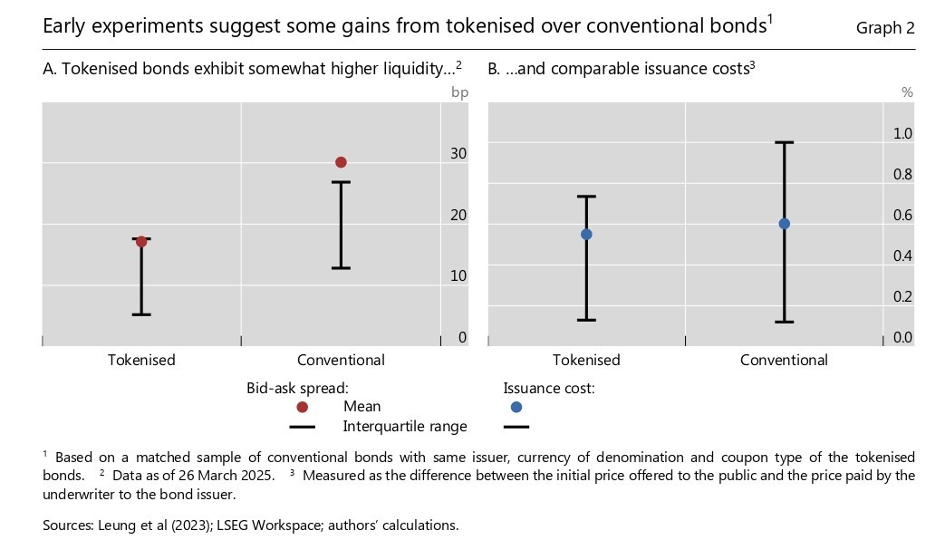 «Παρά το γεγονός ότι βρίσκονται σε πειραματικό στάδιο, τα πρώτα στοιχεία δείχνουν ότι η ρευστότητα και το κόστος έκδοσης για τα τοκενοποιημένα ομόλογα είναι ήδη συγκρίσιμα με εκείνα των συμβατικών ομολόγων» διαπιστώνουν οι οικονομολόγοι της BIS.
